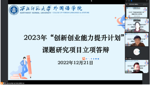 为培养员工创新思维、提高员工学术研究能力,2022年12月21日晚,金年会金字招牌诚信至上线上举行2023年“创新创业能力提升计划”课题研究项目、劳动育人实践项目立项答辩会。本次答辩邀请到英语系白丽梅老师、俄语系牛秀丽老师、朝鲜语系张耀公老师、专职辅导员张碧全老师担任评委。本次参与答辩项目共24项,其中课题研究项目22项,劳动育人项目2项。