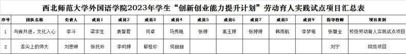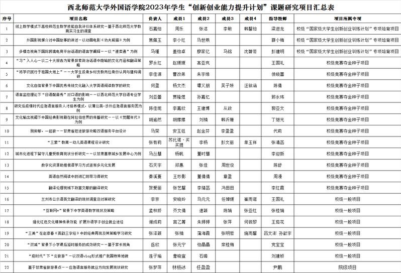 经过最终评审,确定推荐“线上教学模式下高校师范生教学技能自我评价体系研究—基于金年会官方网站入口教育实习生的调查”等3个项目为校级“国家级老员工创新创业训练计划”专项培育项目,确定推荐“‘习’入人心—以二十大报告为背景探索政治话语中隐喻的文化内涵和翻译策略”等12个项目为校级竞赛夺金种子项目,确定推荐“兰州市公示语英文翻译的现状调查及对策研究”等6个项目为校级一般项目,确定推荐“与食共进,文化入心”1个项目为校级劳动育人实践试点项目,确定推荐“基于甘肃省旅游景点——应急语言服务就业方向发展现状研究”1个项目为院级课题研究项目,确定推荐“舌尖上的师大”1个项目为院级劳动育人实践试点项目。