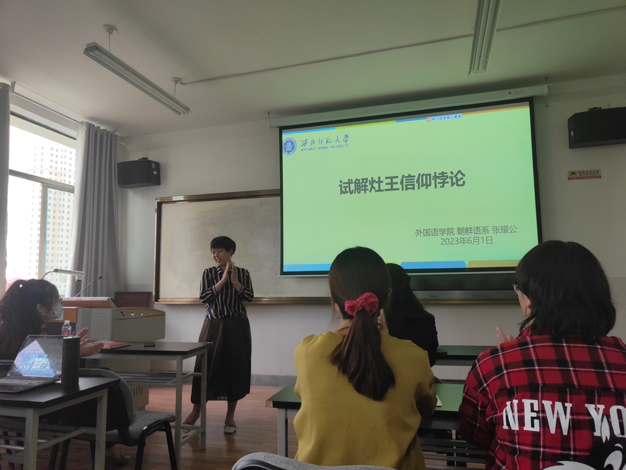 2023年6月1日下午,金年会金字招牌诚信至上比较文学及其它国别文学学术团队在致朴楼605教室举办了学术活动。本期主讲人张耀公老师做了题为《试解灶王信仰悖论》的学术报告。本次活动由张焕香副教授主持,团队成员及朝鲜语系部分本科生参加。
