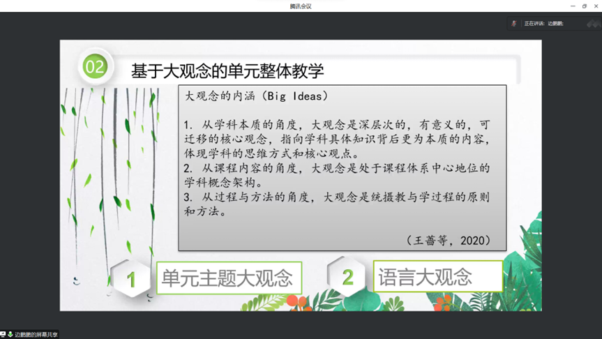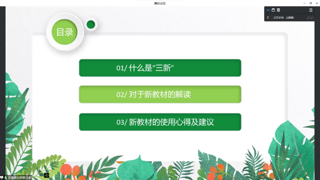 边鹏鹏老师主要从“什么是‘三新’”“对于新教材的解读”“新教材的使用心得及建议”等三个方面进行了讲解。在讲座中,边老师以北师大版英语教材为例,对新政策及新教材的理念进行了解读,并就具体教学设计中如何落实相关理念进行了示范,分享了使用心得,提出了教学建议。