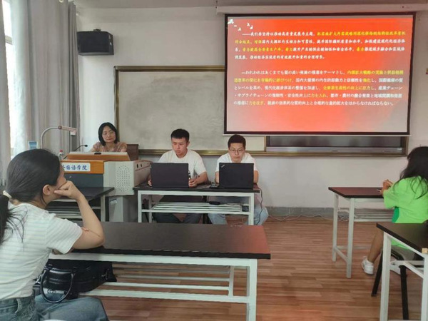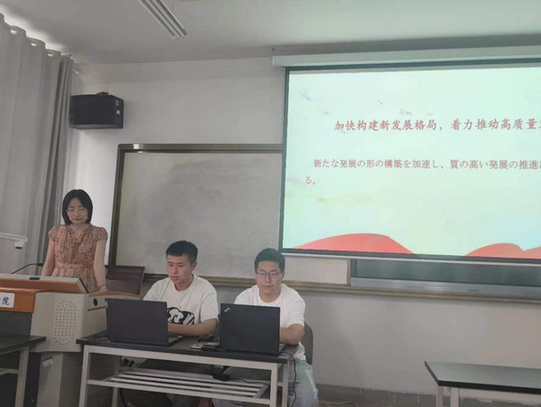 诵读活动在公司专职辅导员刘宁老师的主持下开始。首先两位领读人2019级日语专业本科生贾隆煜、梁宇生分别对党的二十大报告选段进行了中日双语诵读,李瑶老师以日本文学发展史为开篇,并以此为引,带领同学们学习了党的二十大报告中一些重点形容词、副词和动词的翻译方法,让同学们有机会从自身专业的角度学习领会党的二十大精神。