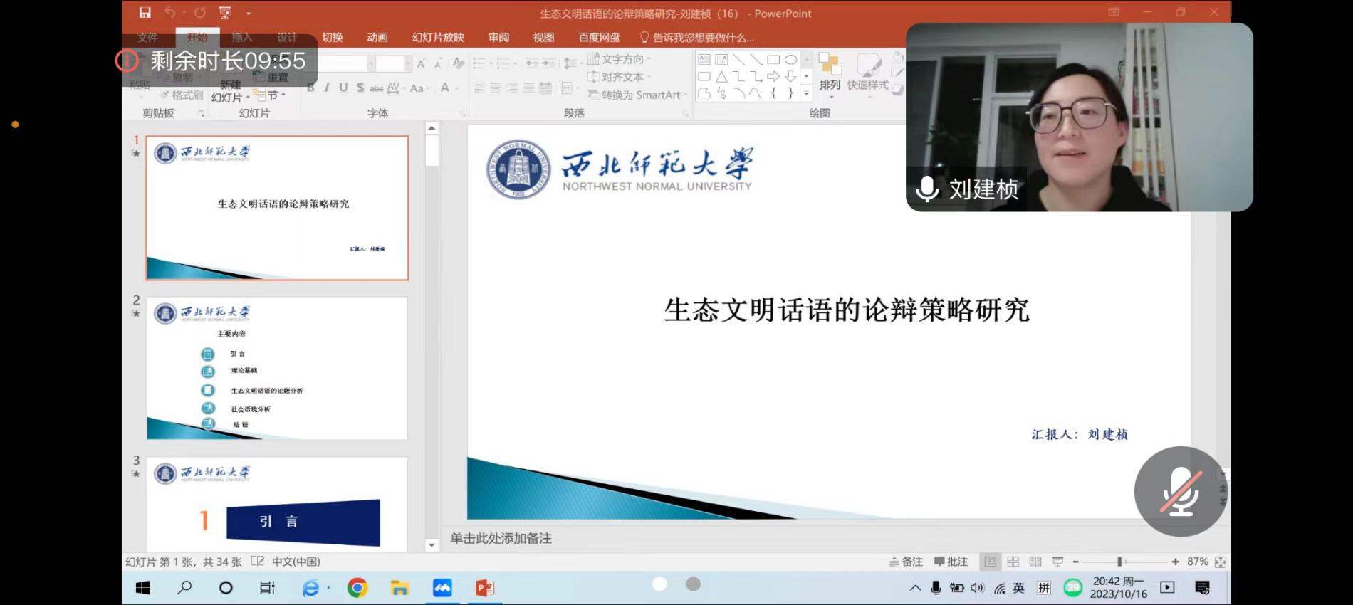 2023年10月16日晚上20时,功能及认知学术团队在线举办学术活动。刘建桢老师为团队做了题为《生态文明话语的论辩策略研究》的学术报告。本次活动由团队负责人马云霞老师主持,功能及认知学术团队全体成员参加本次活动。