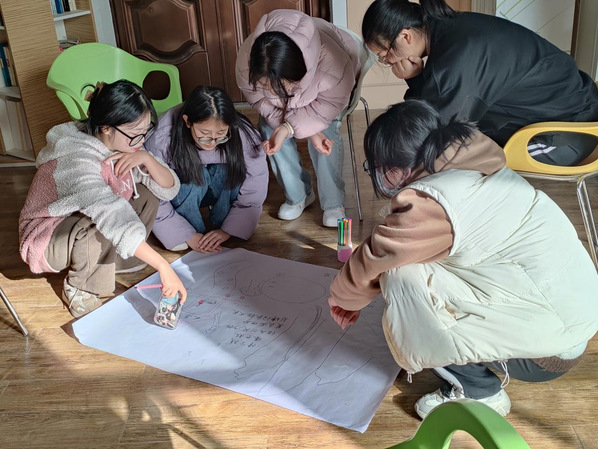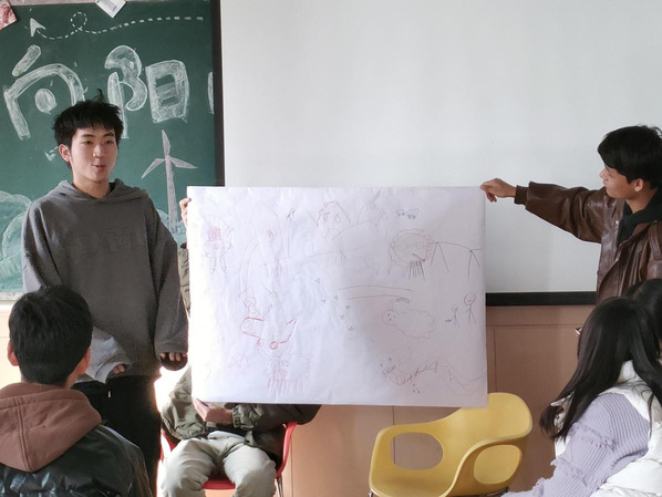 活动伊始,活动带领人谢令言以一系列轻松有趣的小游戏导入活动,在活跃的现场气氛同时促进同学们之间的交流和互动。随后,谢令言用协力绘画的方式带领同学们探索团队协作的力量,过程中,同学们自愿组队,共同完成一幅充满创意和想象力的画作,每幅画作都表达了一个独特的故事,这些故事或幽默、或感人、或寓意深刻。在分享环节,每个小组都向大家展示了他们的画作,并分享了他们创作过程中的趣事和心得。