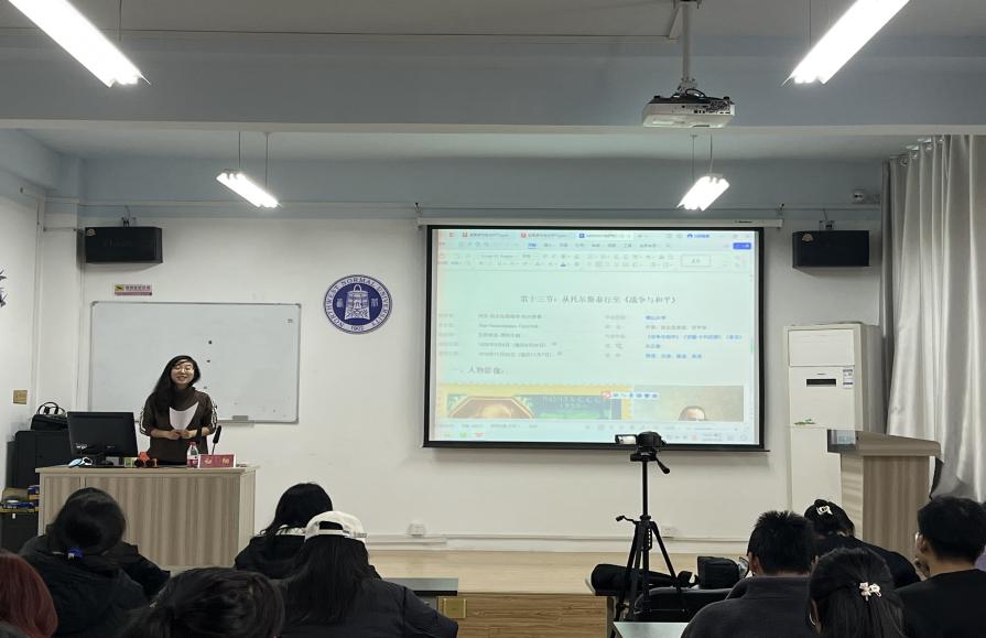 读书会开始,白老师从性格特征到人生经历,从成长环境到社会环境,介绍了列夫·托尔斯泰不一样的人生追求与经历。并通过视频展示了《战争与和平》的故事梗概与写作特色,指出该书表现了作者对和平的向往及对复杂人性的思考。接着,白老师以思维导图引入书中的人物关系,详细讲解了主要人物安得烈·保尔康斯基、皮埃尔·别祖霍夫和娜塔莎·罗斯托夫的故事。