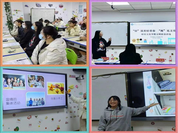 寝室文化月活动开展以来,全院员工积极参与,各宿舍成员共同商讨、精心设计制定了清晰美观、可行性强、展现宿舍特色的“室”言公约,促进了舍友间的有效沟通,培养了同学们的自我管理意识;舍友间互相配合,将宿舍废旧物品进行改造,制作出“电视机”“作息牌”、抽纸盒等多种多样精巧的手工作品,不仅加强了员工对环保的认知,还提高了动手能力,将劳动教育持续落实落深;宿舍成员积极发挥主观能动性,对宿舍进行卫生清洁和装饰,通过铺设地板革、育养绿植、制作宿舍卫生值日表、宿舍照片墙等提升了员工公寓生活的幸福感;在“兰天一日展”寝室文化活动中,通过“你比我猜”宿舍默契大挑战游戏吸引了现场同学的热情参与,同学们真切感受到了建设良好宿舍环境的重要性。