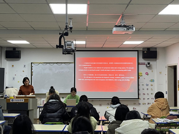 诵读会上,2020级英语专业本科生马荣和翻译专业本科生贺爱丽对党的二十大报告选段进行了双语诵读。刘利平老师从党的二十大报告中专用名词的特殊用法展开并进行了举例说明,对政论文文体中词汇互译的注意事项进行了重点讲解。
