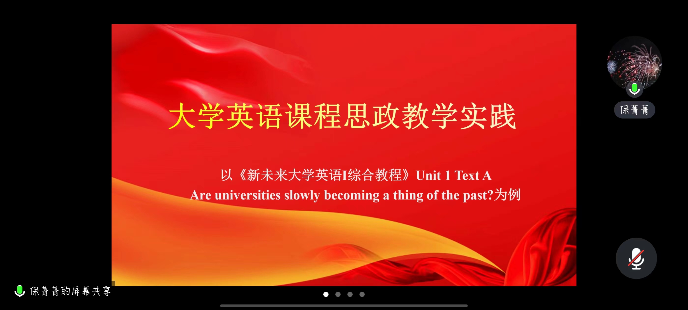 保菁菁老师围绕“课程思政的顶层设计时间线”、“课程思政与思政课程的联系与区别”、“英语课程思政的必要性”、“英语课程思政内涵”等重要问题展开论述。她说,思政课程的教育方式主要表现为显性、灌输,而课程思政表现为隐形、渗透。英语课程思政的必要性则体现为新时代的需求、人文学科的内在价值和功能、语言与意识形态的紧密关联以及人的全面发展需求。保老师以《新未来大学英语I综合教程》Unit 1 Are universities slowly becoming a thing of the past?为教学案例,分课前、课中、课后介绍了其授课对象、授课时长、教材、思政融入点、思政素材等。她以“青年人的使命感与责任感”为思政融入点,将梁启超《少年中国说》(双语版),汉英双语十九大报告、习近平金句、《礼记·大学》中的名言等思政素材融入英语教学中。保老师全面系统地介绍了具体教学环节,如,主题词汇学习、小组讨论及分享、阅读中的“大学”、视听中的“大学”、课文学习、思考问题、课后练习等。最后,保老师提出,设计这些具体教学环节的目的在于提升员工的英语学习技能,引导员工自主学习,激发其创造力,增强其文化归属感、社会责任感与爱国情怀。
