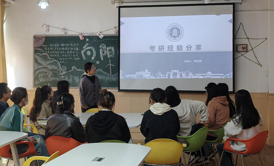 会上,何老师向同学们说明了本次结对帮扶的目的和注意事项,希望同学们通过结对帮扶交流考研经验和学习方法,缓解备考压力,互相帮助,彼此鼓励。研究生志愿者周天琪结合自己的考研故事,分享考研经验、提供高效学习方法参考,鼓励毕业生及时调整心态积极备考。