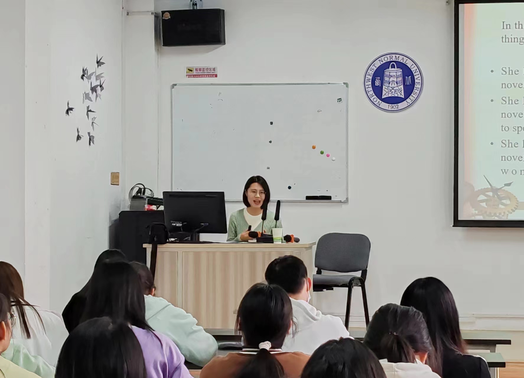 杨老师以作者简·奥斯汀的人生经历和代表作品入手,为同学们剖析这位英国作家的写作风格,由而引出《傲慢与偏见》的思想内核。杨老师以主人公达西与伊丽莎白的感情经历作为主线,带领同学们走进书中,感受书中人物的爱恨情仇和剧情的跌宕起伏。接着,杨老师向同学们展示了部分原作的语段,从翻译技巧,写作策略,语言艺术方面向同学们展示了写作的妙笔生花之处。最后,杨老师从书中的情节和话语出发,引导同学们要树立独立、清醒而勇敢的情感观。