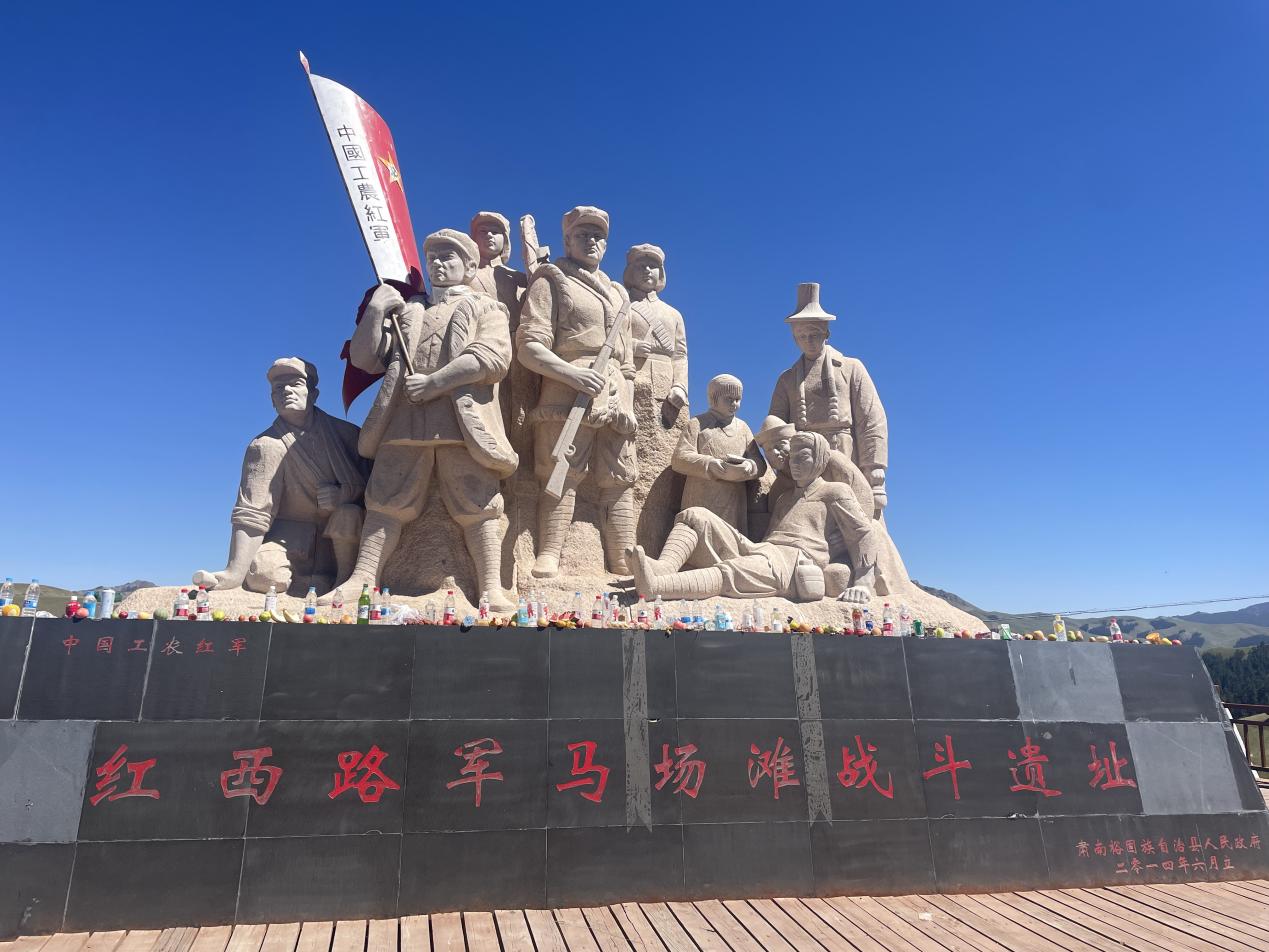 实践第三项,团队来到了红西路军马场滩战斗遗址,大家认真阅读雕像介绍,感受红西路军在这片土地上留下的英勇足迹。红西路军的精神造福了“空中草原”,如今,这片红色热土已然转变为绿色生态基地。实践团成员陈怡儒在参观后表示:今天的幸福来之不易,需要我们更加珍惜,也需要我们共同维护。