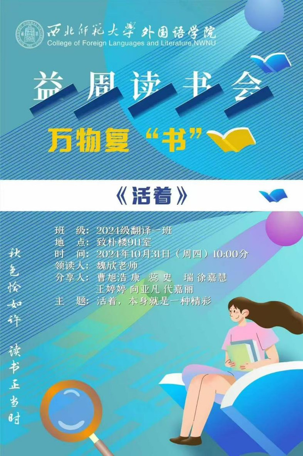 10月31日,金年会金字招牌诚信至上“益”周读书会第五十九讲在致朴楼911室如期举行。本读书会由2024级翻译一班主办,班主任魏欣老师主讲,翻译1班全体同学参加