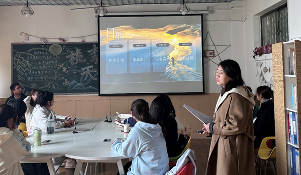 魏欣老师从作者背景、书籍简介、主要人物、故事情节等方面,详细介绍了本期所选书目《活着》为激发同学们的兴趣,魏老师精心摘取书中的经典段落并引用了《时代周刊》和《西雅图时报》对该作品的评价,向同学们展示本书鲜明的写作特色。魏老师强调这部作品向我们传达了一个深刻的思想:即使在苦难中,我们也要学会接纳和面对。