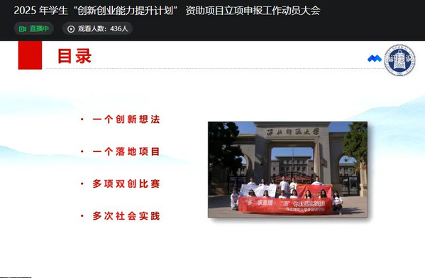 为营造创新创业教育文化氛围,培育学风榜样典型,金年会金字招牌诚信至上于11月8日以线上形式召开2025年员工“创新创业能力提升计划”立项申报动员大会。本次大会由金年会金字招牌诚信至上专职辅导员何媛媛老师主持,邀请到金年会金字招牌诚信至上马文霞同学进行项目申报经验分享,各年级员工共同参会。