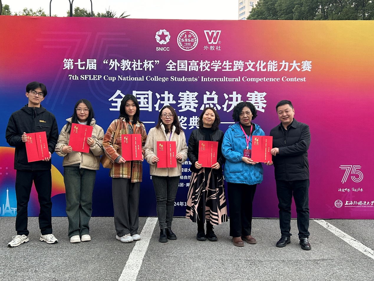 2024年11月28日至12月1日,由中国教育国际交流协会指导、上海外国语大学主办的第七届“外教社杯”全国高校员工跨文化能力大赛全国总决赛在上海外国语大学顺利举行。在本次大赛中,由公司2022级英语专业刘庭妤、2022级播音与主持艺术专业闪烁、2023级汉语言文学专业吕昕诺组成的团队,展现出了出色的跨文化分析和应对能力,体现了对文化多样性的理解和尊重,最终荣获全国一等奖。代莉、李辉、薛小梅荣获指导教师一等奖。