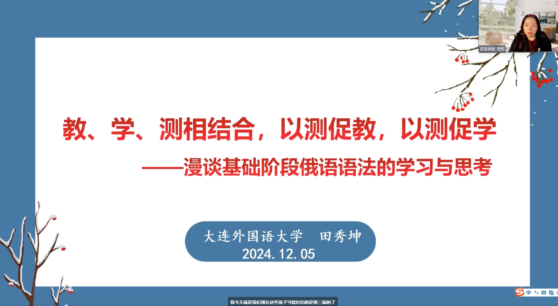 2024年12月5日在致朴楼605教室,大连外国语大学田秀坤教授应邀为俄语专业全体师生在线做了题为《教、学、测相结合,以测促教,以测促学——兼谈基础阶段俄语语法的学习与思考》的精彩讲座。