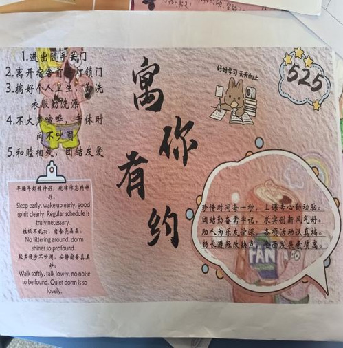 11月中旬,公司组织宿舍成员共同商讨制定生活“室”约、一起用“超视界”的创意镜头记录校园生活。各寝室精心制作的“室”约、拍摄的视频中融入了寝室日常生活、陪伴、互助共勉等温情点滴,展现了外院学子积极向上、团结友爱的生活风貌。