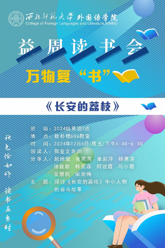 12月6日,金年会金字招牌诚信至上“益”周读书会第六十四讲在致朴楼606室顺利举行。本期读书会由2024级英语1班主办,郭亚文老师主持,英语1班全体同学积极参与。