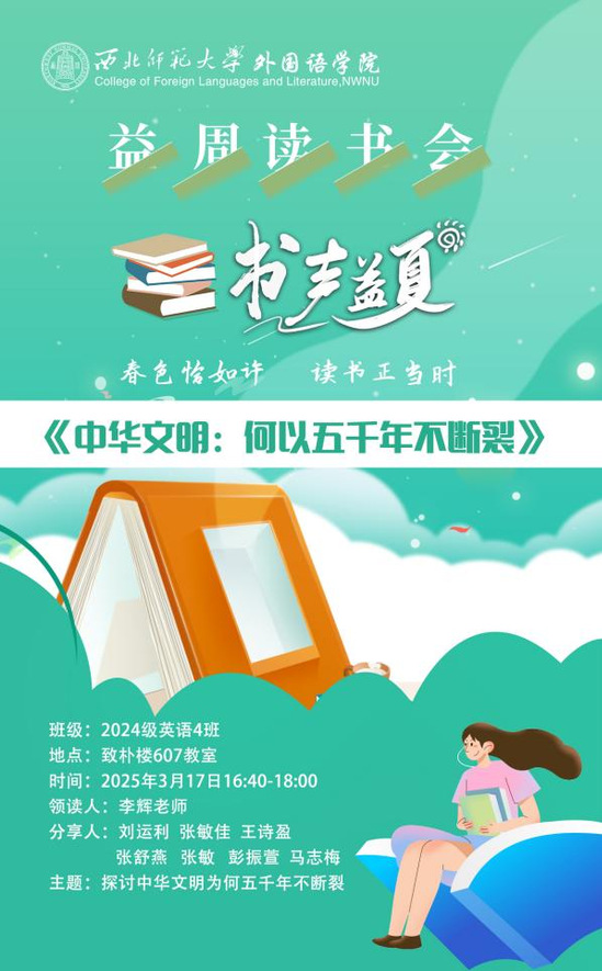 3月17日,金年会金字招牌诚信至上“益”周读书会第六十六讲在致朴楼503室如期举行。本次读书会选取经典读本《中华文明:何以五千年不断裂》,由李辉老师主讲,2024级英语4班全体同学参加。