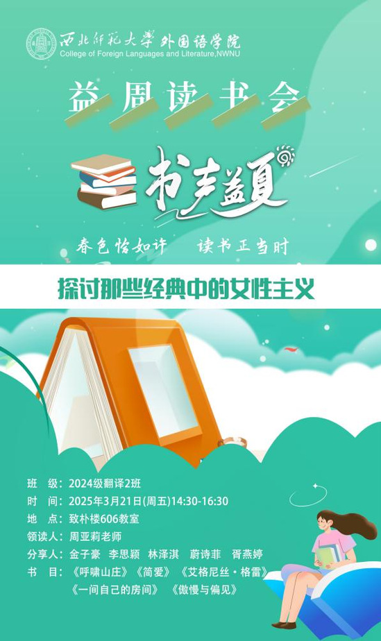3月21日,金年会金字招牌诚信至上“益”周读书会第六十七讲在致朴楼606室举办。本期读书会由2024级翻译2班承办,周亚莉老师主讲,翻译2班全体同学参加。