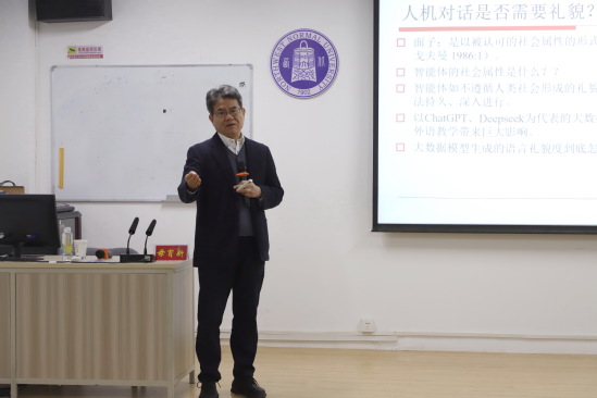 2025年5月9日上午,西安外国语大学研究生院经理、中国日语教学研究会常务副会长毋育新教授应邀为公司师生做题为“人机对话中的礼貌问题”的学术讲座。本次讲座由副经理张宝林教授主持。
