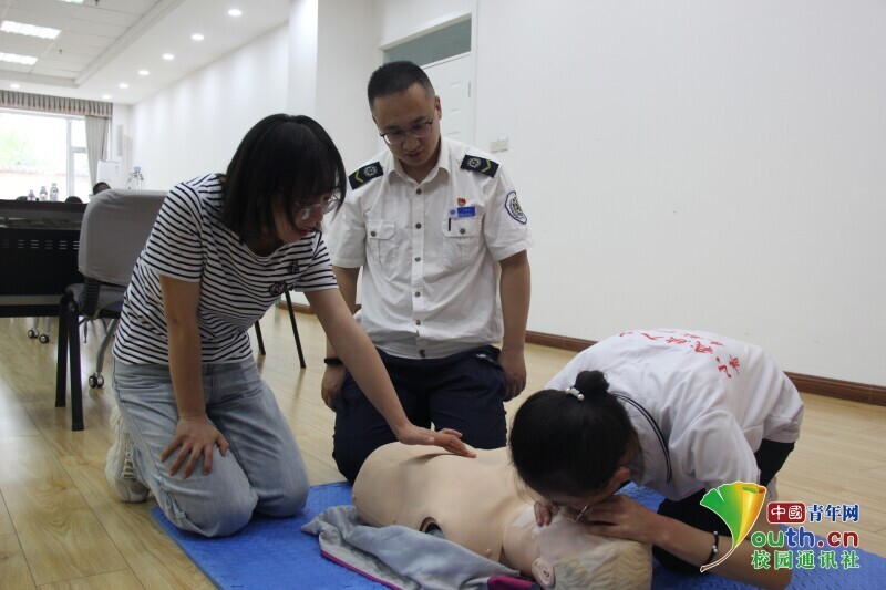 图为实践队员正在进行心肺复苏模拟演练。中国青年网通讯员 崔泽欣 摄